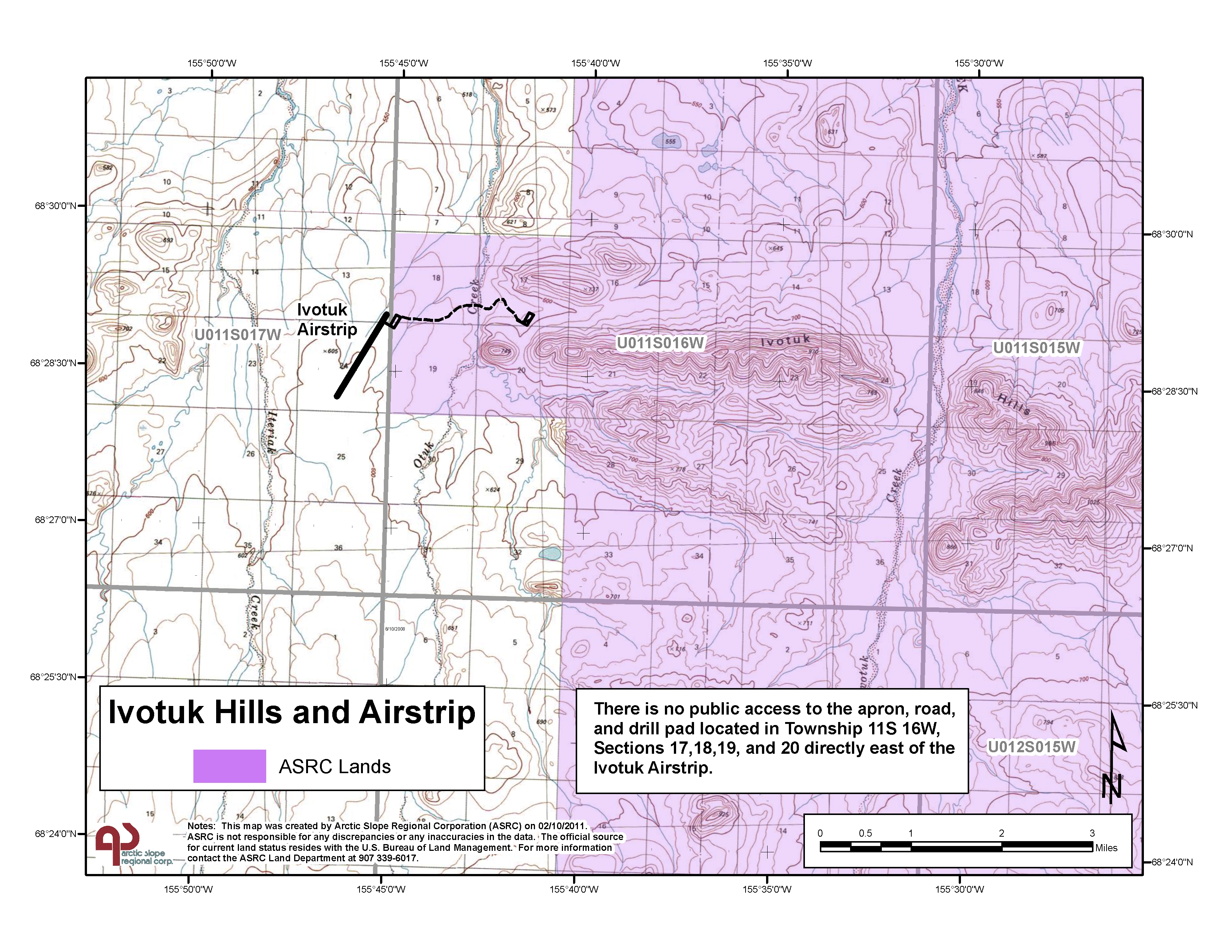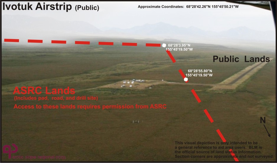 These airstrips are subject to periodic surveillance by ASRC and its agents. Trespassers will be prosecuted. In addition, anyone creating or using unapproved airstrips on ASRC property will be prosecuted to the fullest extent of the law. Area users should also be aware that there are ASRC lands immediately east of the Ivotuk Airstrip (Ivotuk Hills Map) that include the pad, road, and drill site. Access to these lands requires permission from ASRC.